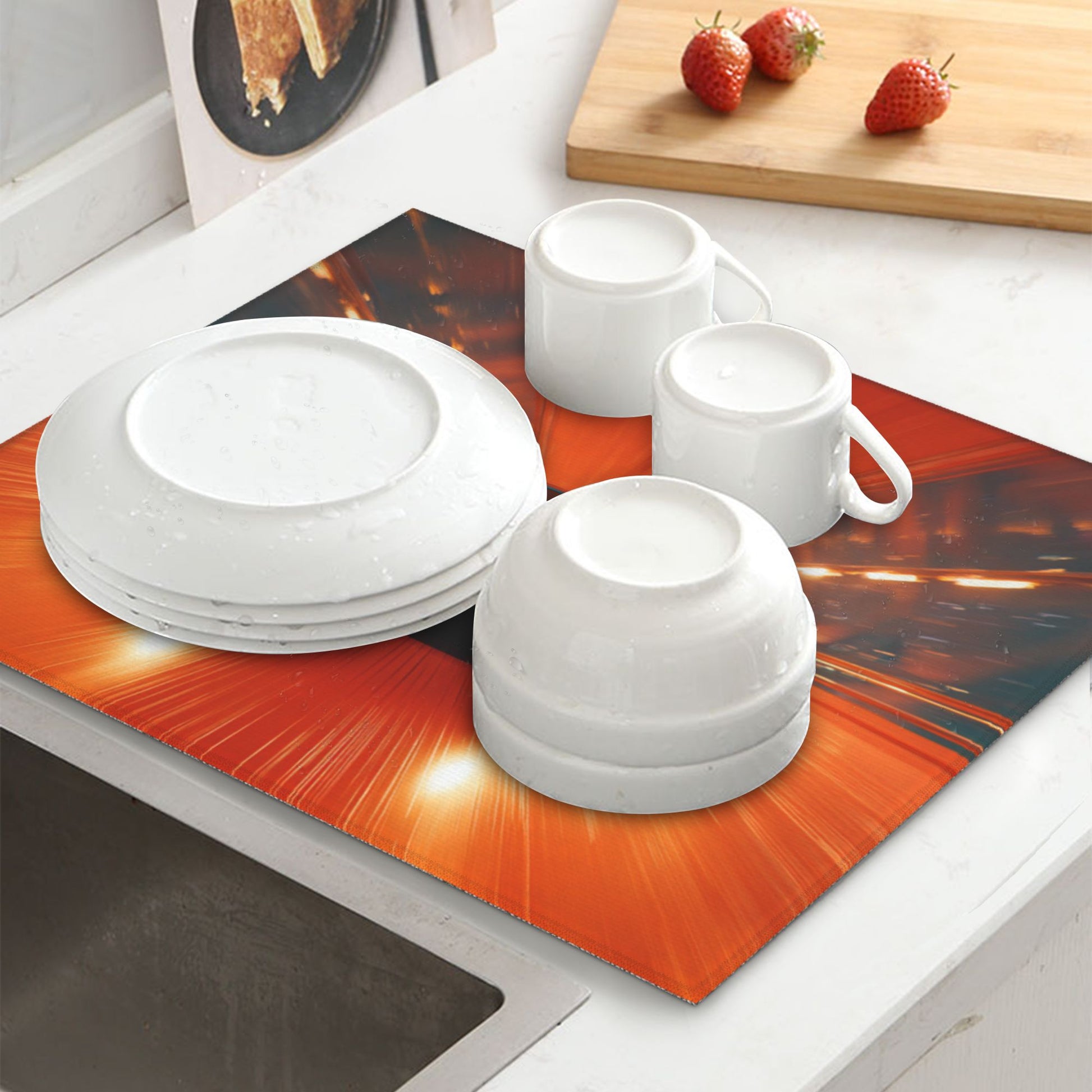 Made with a soft printed polyester surface, sponge-like inner absorbent core, and a non-slip mesh backing. It rapidly absorbs excess water from dishes, cookware, and glasses while keeping your counters dry and safe.