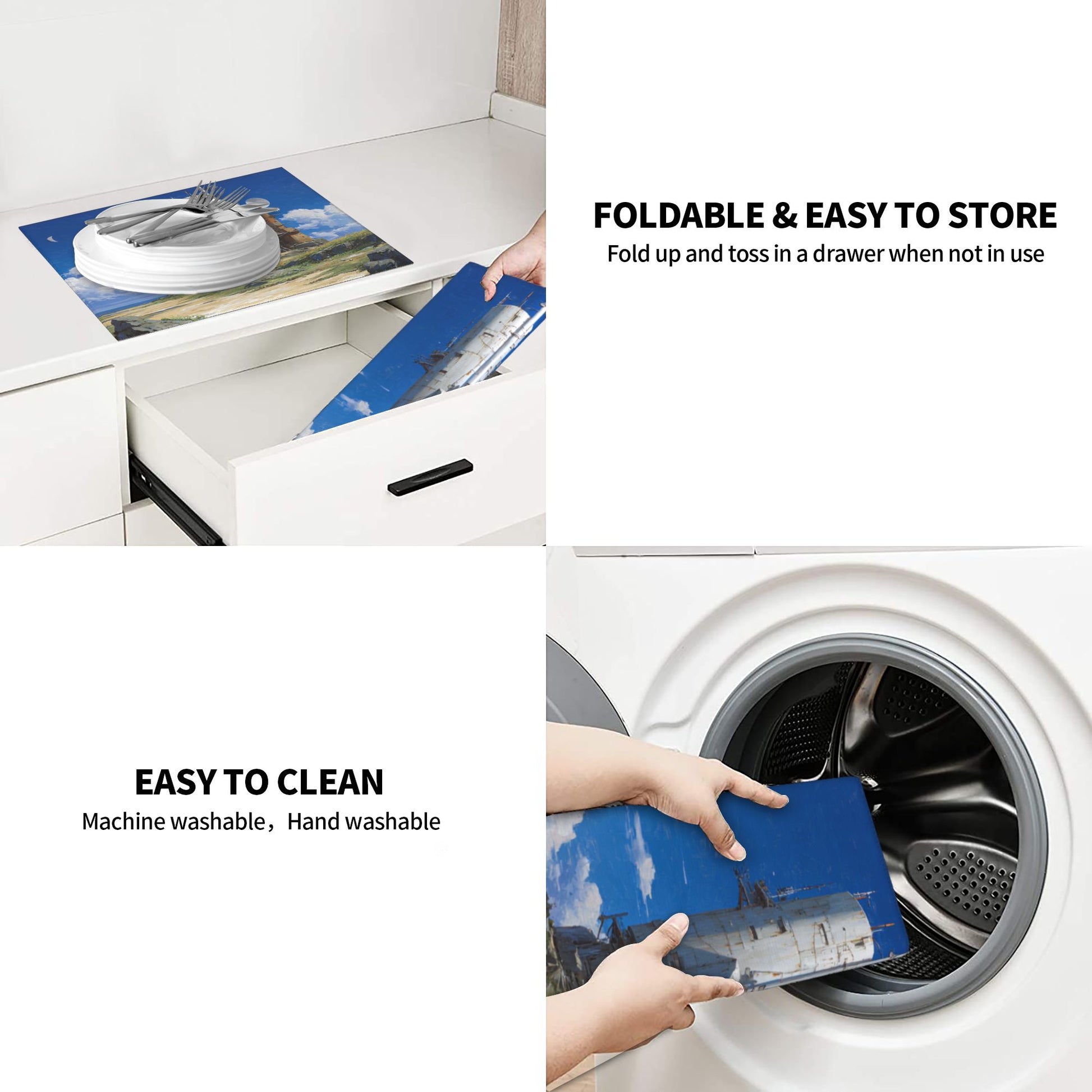 Usage Scenarios: Dish drying, under appliances, coffee bar, food prep zone, RV or studio kitchens