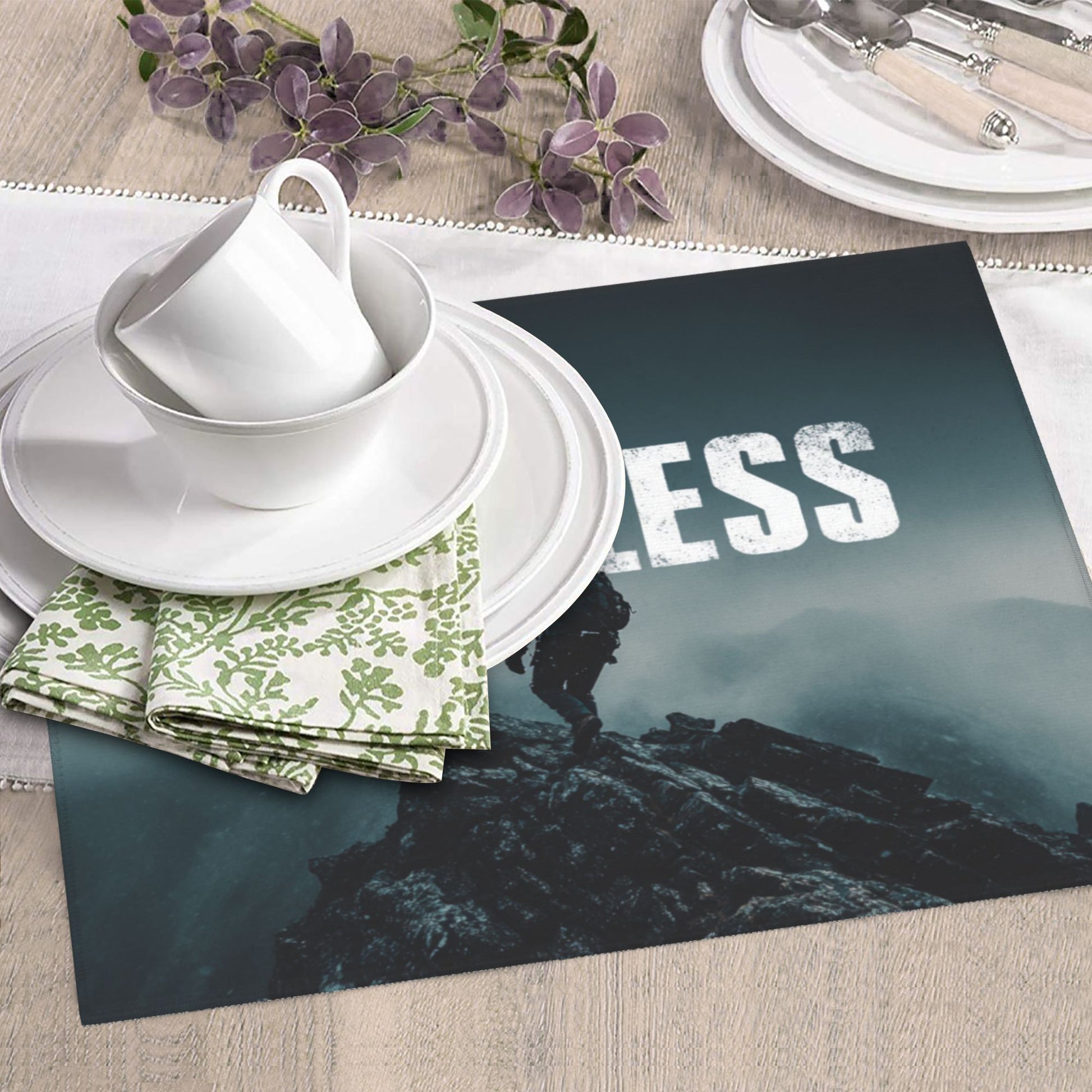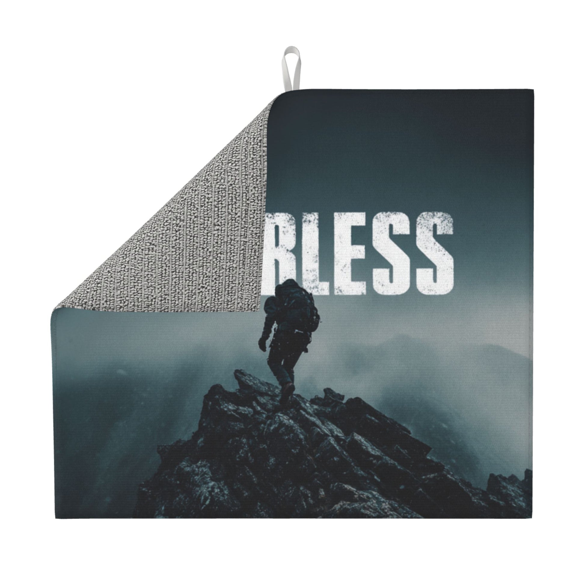 Showcasing a lone explorer scaling a jagged mountain ridge, this mat captures the spirit of perseverance and adventure. The moody gray-blue hues and distressed "FEARLESS" typography make it a striking statement in any kitchen.